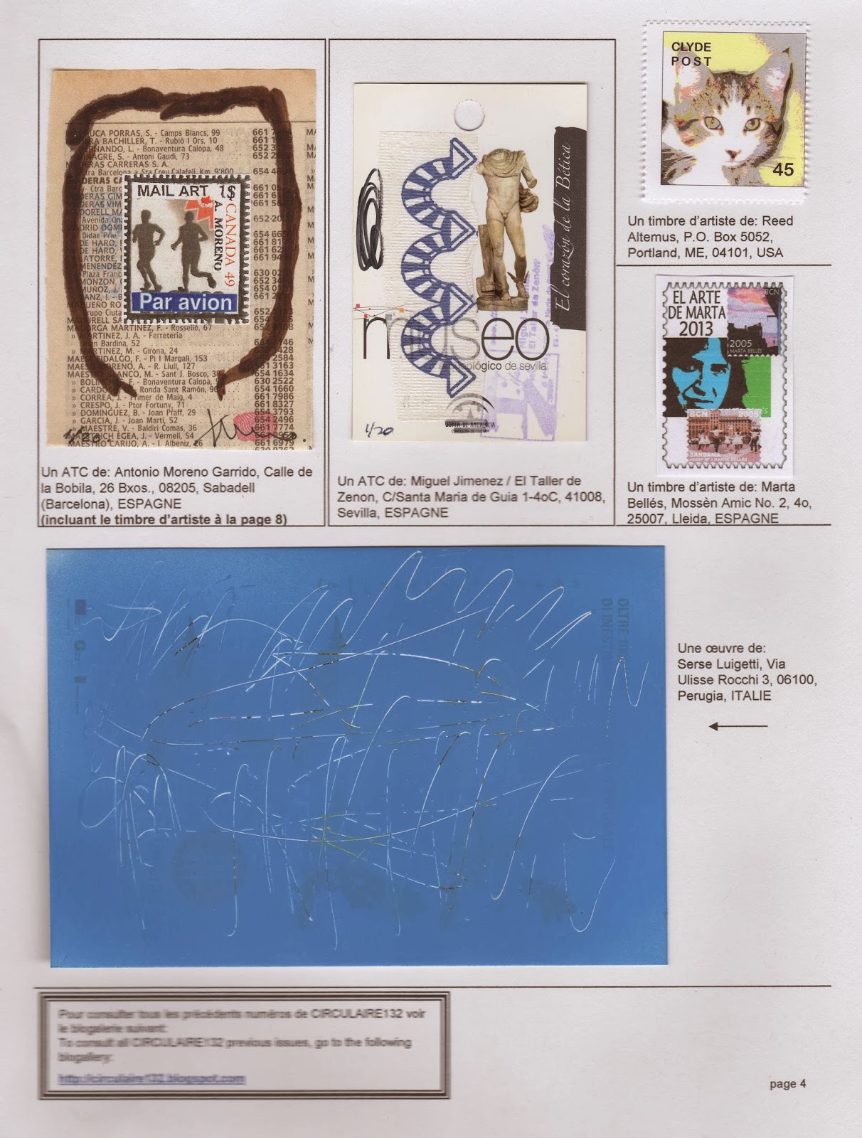 Zine d'assemblage sur l'art postal en général destiné aux mailartistes pour permettre l'échange d'idées, faire connaître divers projets. Pour participer, faire parvenir 25 originaux de timbres d'artiste, ATC, cartes postales personnalisées, oeuvres de format 8cm X 8cm, poèmes etc... signés et numérotés. Une copie originale du zine sera envoyée à chaque participants. CIRCULAIRE132 - 114-3699 Av. Des Compagnons, Québec (Québec), G1X 4Y4, CANADA